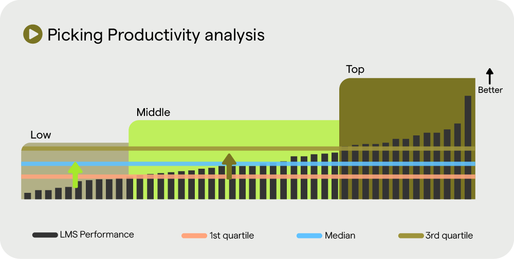 Success stories from Falconi’s extensive experience in supply chain optimization highlight the benefits of focused improvements. For example, a global food and beverage company realized annual personnel savings of $152,000 by standardizing a single picking process across warehouses—a simple yet effective strategy. Below, an initial analysis of picker productivity shows significant variability within one picking process in one warehouse:
